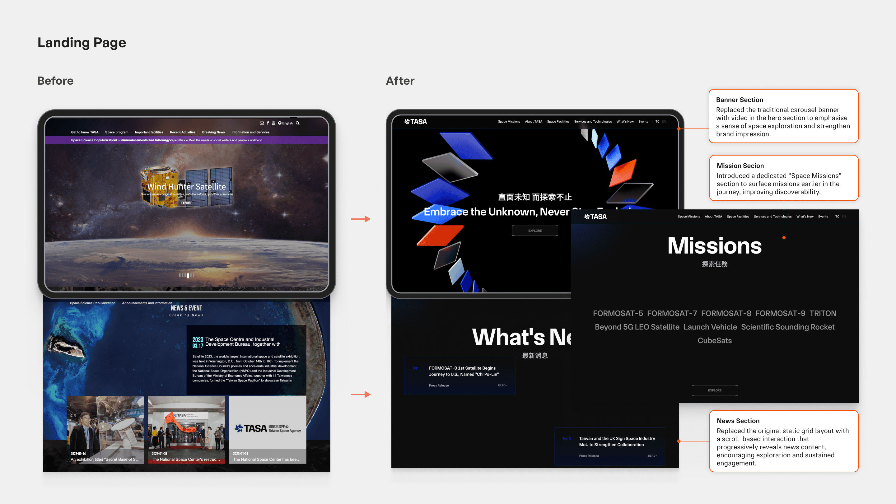 Inspired by TASA’s brand spirit, “Embrace the Unknown, Never Stop Exploring,” we crafted a visual language that balances a sense of futurism with exploration. Dynamic light and shadow effects respond to cursor movement, creating an immersive, space-like experience. Playful visuals combined with improved navigation and information architecture make it easy for space enthusiasts to explore and understand TASA’s missions and services.