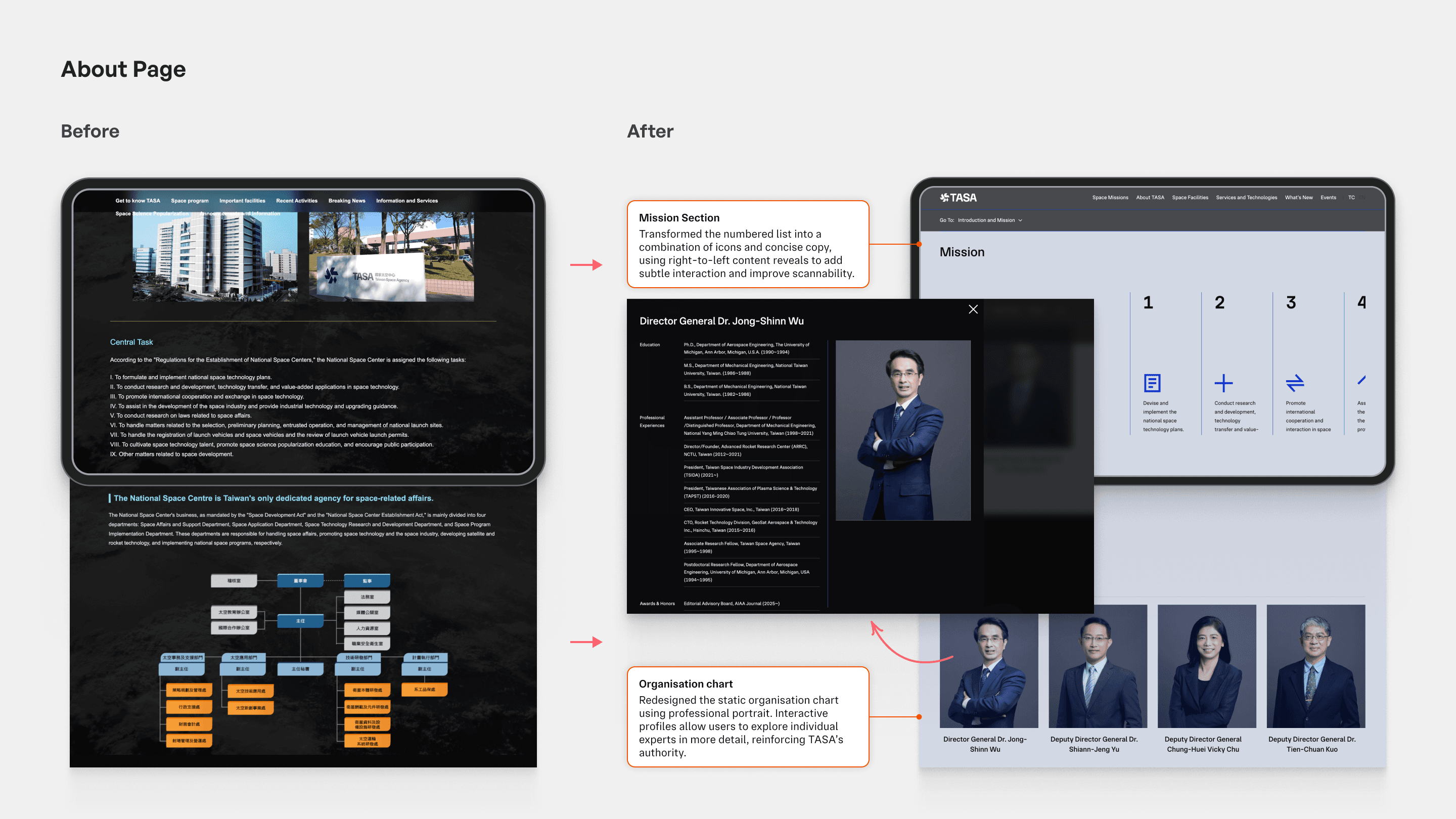 The old website design was outdated, lacked interactive elements and responsive design, resulting in a text-heavy layout that failed to effectively communicate TASA's missions and services to the public.