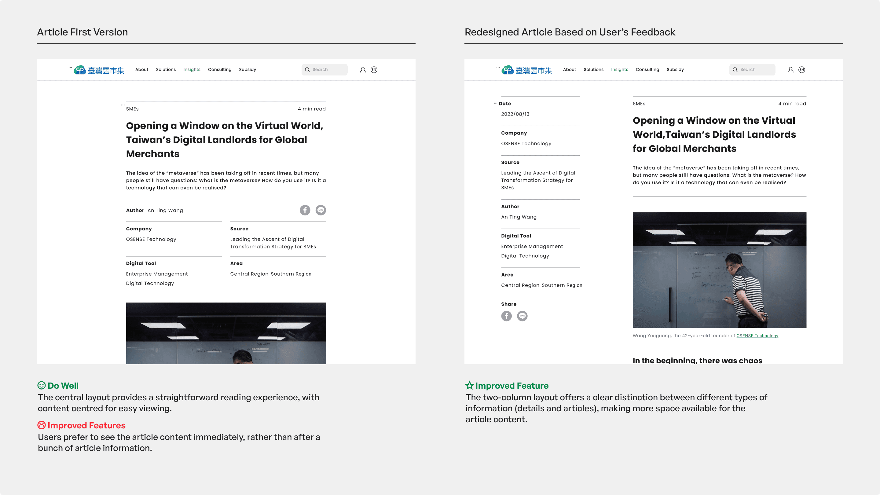 As the sole product designer, I led the redesign of end-to-end user flows across both the front-end experience and the back-end content management system. I conducted heuristic evaluations and reviewed GA4 data to identify key usability issues, then validated solutions with real users through high-fidelity prototyping to ensure a user-centred design approach.