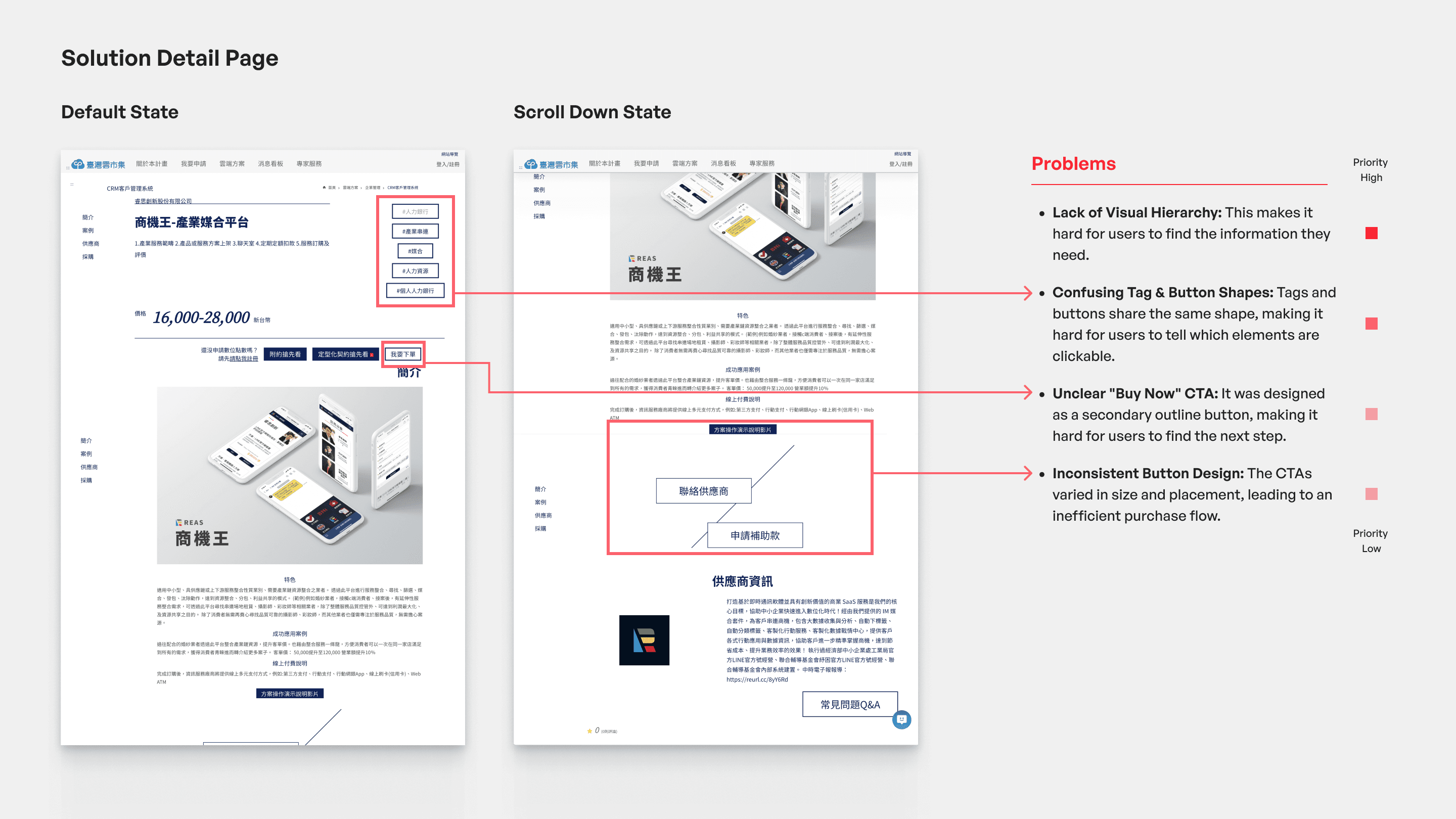The redesigned solution detail page replaces clutter with a structured layout and high-contrast CTAs. This allows users to digest technical specifications at a glance and move toward a purchase decision with total confidence.